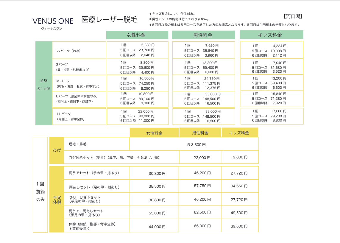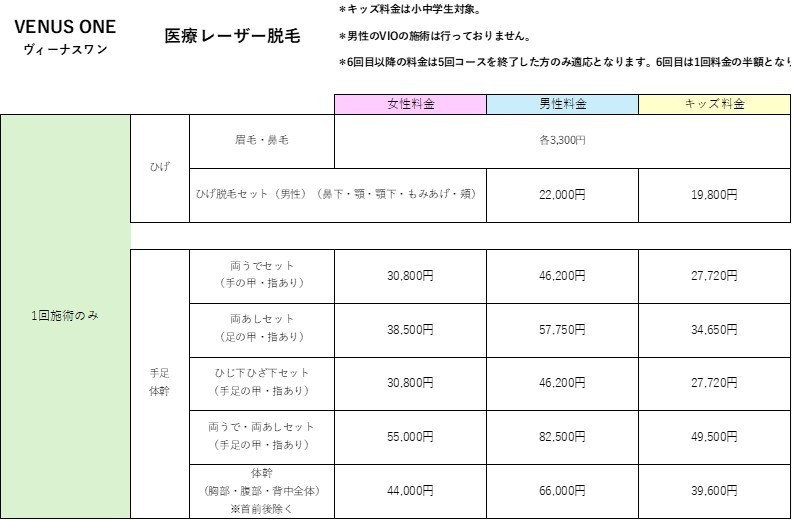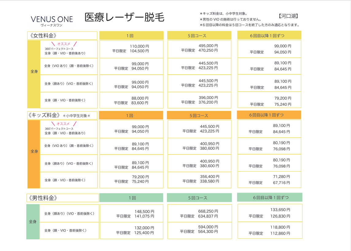 | 全身(VIOあり)(顔・首前後除く) | 1回 99,000円 5回 445,500円 6回目以降1回ずつ 89,100円 |
