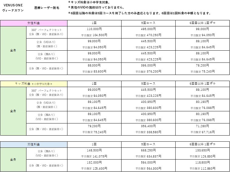 | ✨院長オススメ✨ 360°パーフェクトコース 全身脱毛(顔・VIO・首前後含む) | 1回 110,000円 5回 495,000円 6回目以降1回ずつ 99,000円 |